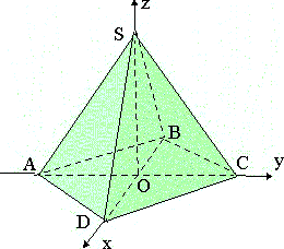 | Задача. На рисунке изображена правильная пирамида с высотой OS = 3 ед. и стороной основания , равной 4 ед.