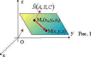 , перпендикулярный плоскости Q (нормальный вектор плоскости) и точка М0(x0, y0, z0). Точка М(x, y, z) - произвольная точка плоскости (рис. 1)