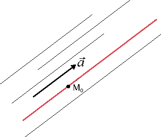 Если различные прямые имеют один и тот же направляющий вектор, то они параллельны. Направляющий вектор определяет множество параллельных прямых. Если задать точку, то она выделит из этого множества единственную прямую (рис. 1). Таким образом, прямая может быть задана направляющим вектором и точкой М0(х0, у0).Пусть М(х, у) произвольная точка этой прямой. Тогда из условия коллинеарности векторов и следует
