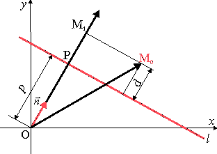 Пусть дана точка М, и требуется найти расстояние от этой точки до прямой l (плоскости Q). Расстояние d от точки до прямой (плоскости) равно модулю числа, полученного в результате подстановки координат данной точки в левую часть нормального уравнения прямой (плоскости).