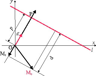 При любом расположении точки М0 и прямой l расстояние d между ними равно расстоянию между точкой Р и проекцией М1 точки М на ось ОР с ортом