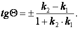 Угол α между прямыми у = k1·x + b1 и у = k2·x + b2 находится по формуле