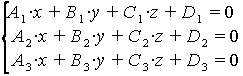 Задача нахождения точки пересечения прямой с плоскостью сводится к решению системы трёх уравнений 1-ой степени с тремя неизвестными