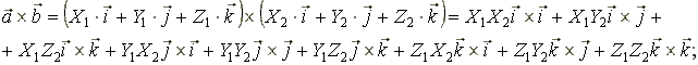 На основании свойств 2 и 3 можно перемножать векторные многочлены и объединять числовые коэффициенты векторных сомножителей. Векторное произведение векторов, заданных координатами