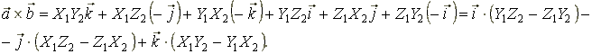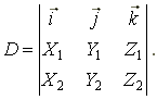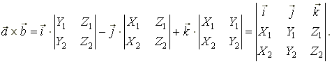 Итак, чтобы найти векторное произведение векторов ![]() , и в разложении определителя по элементам первой строки являются координатами вектора , равного .Чтобы найти векторное произведение , где и надо вычислить определитель, у которого в первой строчке стоят элементы , и ; во второй строке координаты первого множителя (Х1, Y1, Z1); в третьей строке координаты второго множителя (Х2, Y2, Z2).