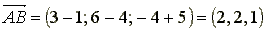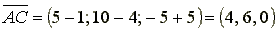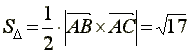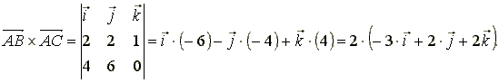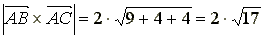 ![]() .Задача. Вычислите с помощью векторного умножения площадь треугольника АВС, где А (1, 4, - 5), В (3, 6, - 4), С (5, 10, - 5). Решение. Модуль векторного произведения равен площади параллелограмма, построенного на векторах - сомножителях; площадь треугольника АВС равнаиполовине площади параллелограмма ABCD.