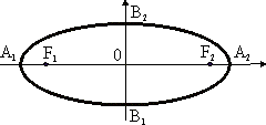 . Отрезок А1А2 = 2а называется большой осью эллипса. Соответственно отрезок ОА2 называется большой полуосью эллипса. (точнее, большая ось –та, на которой лежат фокусы эллипса).Отрезок В1В называется малой осью эллипса, а отрезок ОВ2 = b – его малой полуосью. Точки А1, А2, В1, В2 называются вершинами эллипса.
