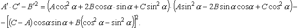 Докажем, что выражение А·B - C2 остается неизменным как при переносе, так и при повороте осей, то есть не зависит от преобразования координат. Действительно, при параллельном переносе этот факт очевиден [см. формулы (12.1) и (12.5)]; проверим его при повороте осей. Для этого воспользуемся выражениями для коэффициентов А', В' и С' уравнения (12.6)