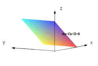 - A·x + C·z + D = 0 - уравнение плоскости, параллельной оси ОY. На координатной плоскости ОXZ уравнение плоскости