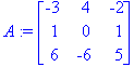 > with(linalg):A := matrix(3,3,[-3,4,-2,1,0,1,6,-6,5]);