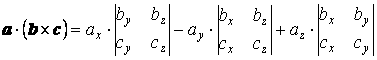 который умножается скалярно, во второй строчке — координаты первого вектора сомножителя в векторном произведении, в третьей строчке — координаты второго вектора сомножителя в векторном произведении