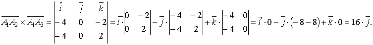 Найдём через векторное произведение найденных векторов, разложив определитель по первой строке: