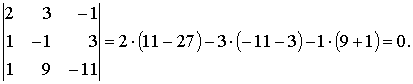 Определить коллинеарность векторов a = (2, 3, − 1), b = ( 1, − 1, 3), c = ( 1, 9, − 11 ).