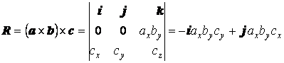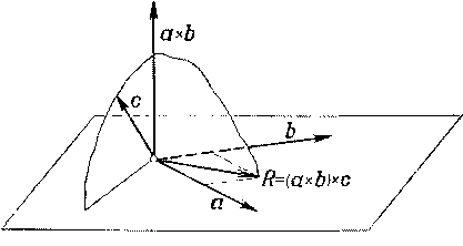 Этот вектор R является векторным произведением вектора a × b и вектора c. Поэтому вектор R перпендикулярен и к вектору a × b и к вектору c.