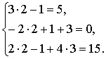 Первая строка задает уравнения системы, Вторая строка определяет решение системы, третья строка проверка определяет проверку решения системы.