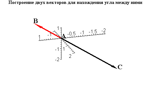 > with(plots):a1:=arrow(<0,0,0>,<1,-1,1>,width=[0.04, relative], head_length=[0.3, relative], color=red):a2:=arrow(<0,0,0>,<-2,2,-2>,width=[0.02, relative], head_length=[0.1, relative], color=black):t1:=textplot3d([0,0,0,`A`], color=black,font=[TIMES,BOLD,14]):t2:=textplot3d([1,-1,1,`B`], color=black, font=[TIMES,BOLD,14]):t3:=textplot3d([-2,2,-2,`C`], color=black, font=[TIMES,BOLD,14]):plots[display](a1,a2,t1,t2,t3,title=`Построение двух векторов для нахождения угла между ними`, titlefont=[TIMES,BOLD,10]);