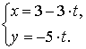 Составить параметрическое уравнение прямой, пересекающей оси Ох и Оу в точках А(3, 0) и В(0, − 5).
