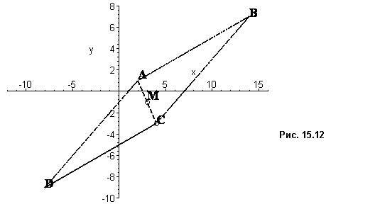 Эта вершина параллелограмма будет иметь координаты А(2, 1). Так как точка М является точкой пересечения диагоналей параллелограмма, то в этой точке диагонали делятся пополам (рис. 15.12)