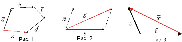 Суммой нескольких векторов называется вектор, замыкающий ломаную, составленную из слагаемых векторов так, что начало каждого звена, начиная со второго, совпадает с концом предыдущего, и направленный от начала ломаной к её концу (рис. 1):