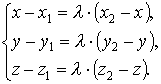Выведем формулы, выражающие координаты точки деления через координаты начала А(x1, y1, z1) и конца отрезка В(x2, y2, z2) отрезка. Для того, пользуясь определением, запишем
