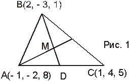 Задача 1. Найдите координаты центра тяжести М треугольника с вершинами А(-1, - 2, 8), В(2, - 3, 1), С(1, 4, 5). Указание. Центр тяжести треугольника совпадает с точкой пересечения его медиан.