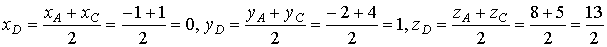Решение. Точка D делит отрезок АС пополам, поэтому координатами точки D будут