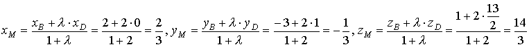 Точка М делит отрезок BD в отношении 2 : 1, поэтому координатами точки М будут