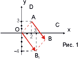 Например, построим вектор AB = [3, - 4], если точка А имеет координаты А(2; 3).Строится вектор OB1 = [3, - 4], затем этот вектор параллельно самому себе переносится в точку А.