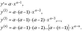 Вычислим n - ю производную степенной функции y = xα, x > 0, (α-любое вещественное число).