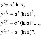 Вычислим n - ю производную показательной функции y = ax (0 < a ≠ 1). Последовательным дифференцированием получим