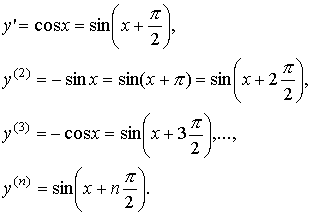 Вычислим n - ю производную функции y = sin x. Последовательным дифференцированием получим