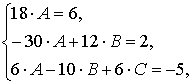 В левой части соотношения (9) раскроем скобки и сгруппируем слагаемые по убывающим степеням аргументаx2 (18 A) + x ( - 30A + 12 B ) + ( 6 A - 10 B + 6 C ) = 6 x2 + 2 x - 5.