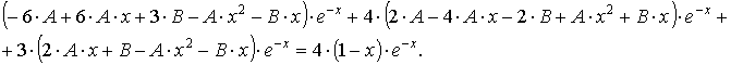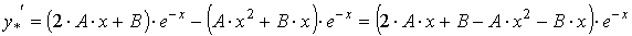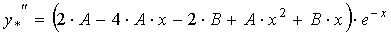 Частное решение уравнения (1) подберём по правой части. Так как правая часть уравнения есть многочлен первой степени, умноженный на экспоненту е-х, и так как среди корней характеристического уравнения есть корень, равный - 1, то частное решение уравнения (1) ищем в видеy* = x ( A x + B ) e-x = ( A x2 + B x ) e-x. (5)