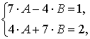 В левой и правой части соотношения (8) раскроем скобки и сгруппируем слагаемые по sinx и cosx:( 7 A - 4 B ) cos x + ( 7 B + 4 A ) sin x = cos x + 2 sin x.