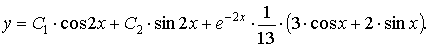 Частное решение уравнения (1) подберём по правой части. Так как правая часть уравнения (1) есть произведение многочленов нулевой степени на sin 2x, cos 2x и на е-2х, то частное решение уравнения (1) ищем в виде произведения многочленов нулевой степени на sin 2x, cos 2x и на е-2х:y* = e- 2x ( A cos x + B sin x ). (5)