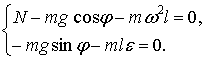 Разложим силу тяжести mg на тангенциальную mg sin φ и нормальную mg cos φ составляющие. Добавим к системе активных сил mg и реакции связи N, силы инерции mω2l и mε l. Для составления уравнений движения воспользуемся принципом Даламбера: система активно действующих сил, сил реакций связей и сил инерции образует равновесную систему. Т. е. эта система удовлетворяет условиям равновесия статики