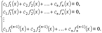 Доказательство. Пусть система функций f1(x), f2(x), …, fn(x) линейно зависима, то есть не для всех одновременно равных нулю c1, c2, , cn выполняется соотношение