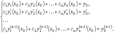 Доказательство. То что (6) есть решение уравнения следует из теорем 1 и 2. Покажем, что можно найти такие постоянные c1, c2, , cn , что функция (6) будет удовлетворять заданным начальным условиям