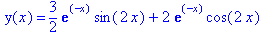 > plots[odeplot](F,[x,y(x)],0..4,labels=[x,y],color=black,thickness=2); (смотри рисунок.) Замечание. В теории колебаний вышеприведённый график соответствует случаю "мягкого демпфирования" (корни характеристического уравнения комплексные, действительная часть этих корней отрицательна). Для жёсткого демпфирования график колебания имеет вид (корни характеристического уравнения действительные, различные и отрицательные).