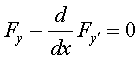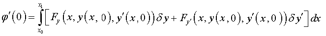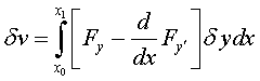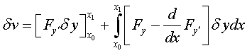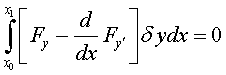 на кривой у = y (x), реализующей экстремум, является заданной непрерывной функцией, а второй множитель δ y, ввиду произвола в выборе кривой сравнения у = у0 (х), является произвольной функцией, удовлетворяющей лишь некоторым весьма общим условиям, а именно: функция δ y в граничных точках х = х0 и х = х1обращается в нуль, непрерывна и дифференцируема один или несколько раз, δ y или δ y и δ y ' малы по абсолютной величине. Исходя из вышесказанного, получим уравнение Эйлера