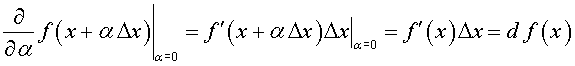 Можно дать и другое определение дифференциала функции и вариации функционала. Рассмотрим значение функции f (х + α Δ x) при фиксированном х и Δ x и изменяющихся значениях параметра α. При α = 1 получим приращенное значение функции f (х + Δ x), при α = 0 получим исходное значение функции f (х). Производная от f (х + α Δ x) по α при α = 0 равна дифференциалу функции f (х) в точке х.