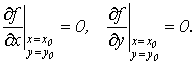 Действительно, фиксируя попеременно х = х0 или у = у0, получим попеременно функцию одного аргумента, для которой воспользуемся необходимым условием экстремума функции одного переменного.