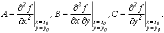 Пусть в некоторой области, содержащей точку М0(х0, у0), функция f (x, y) имеет непрерывные частные производные до второго порядка в точке М0(х0, у0) и некоторой её окрестности. Пусть, кроме того, пусть в этой точке М0(х0, у0) выполняются необходимые условия экстремума функции f (x, y)