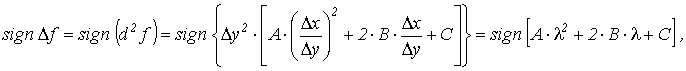 Знакоопределённость квадратного трёхчлена, а значит определённость знака приращения функции для любых значений λ, имеет место только в одном случае - в случае отрицательного дискриминанта квадратного трехчлена В2 – А С < 0. Если к тому же А < 0, то квадратный трехчлен отрицателен для любых значений λ, значит отрицательно приращение функции, что соответствует случаю локального максимума функции в данной точке.