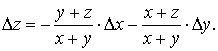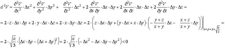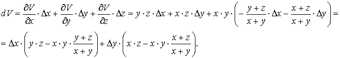 Как видно, эта задача относится к задачам на нахождение условного экстремума. В силу дополнительных условий, переменные Δх, Δу, Δz не являются независимыми, а связаны соотношением (у + z)·Δx + (х + z)·Δy + (х + y)·Δz = 0, из которого найдём