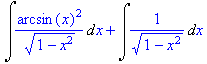 > s1:=Int(op(1,f1),x)=changevar(arcsin(x)=u,Int(op(1,f1), x), u);#В первом интеграле, сделав замену переменной,придём к табличному интегралу