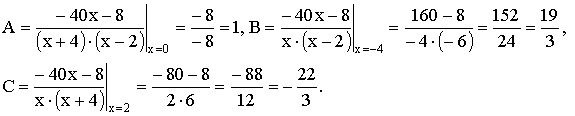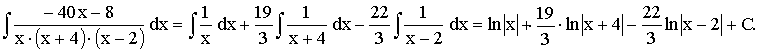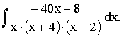>f:=(x)->(-40*x-8)/(x*(x+4)*(x-2)); — задаётся подынтегральная функция