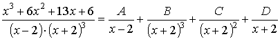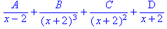> A/(x-2)+B/(x+2)^3+C/(x+2)^2+D/(x+2); — задаётся разложение рациональной дроби на простейшие