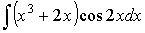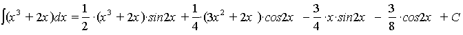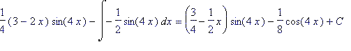 >with(student):g:=(x)->cos(4*x):f:=(x)->3-2*x:intparts(Int(g(x)*f(x), x), f(x))=collect(intparts(int(g(x)*f(x), x), f(x)),sin(4*x))+C;#интегрирование по частям