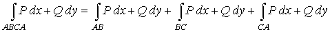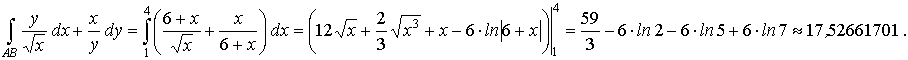 Уравнение стороны АВ: − x + y − 6 = 0 запишем в виде уравнения прямой с угловым коэффициентом y = x + 6. Применяя метод вычисления криволинейного интеграла второго рода в декартовых координатах, будем иметь